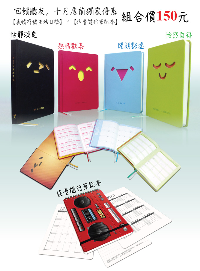 超值優惠:即日起至10月31日止,【表情符號生活日誌】+【佳音隨行筆記本】單本合購, 特價150元。