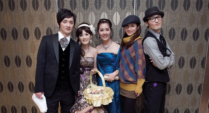 柏翰(左1)結婚時和媽媽(中)、柏青夫婦(右1、2)合影